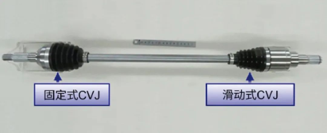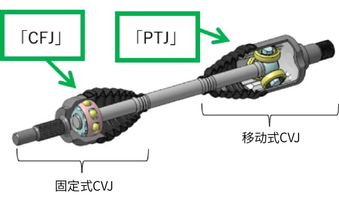 驅動軸是一個將電機或其他動力傳動單元的動力(扭矩)傳遞到輪胎的部件。它由一個輪胎側的固定式等速萬向節(jié)(CVJ)、一個動力傳動側的移動式等速萬向節(jié)(CVJ)以及連接這兩個CVJ的軸組成。