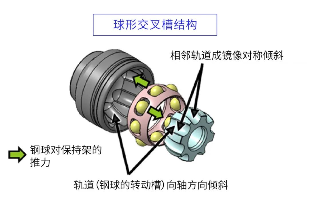 “CFJ”是一種固定式CVJ(等速萬向節(jié)),它極大地改變了NTN傳統(tǒng)萬向節(jié)的基本結構,并采用了NTN獨有的“球形交叉槽結構*4”,該結構可以抵消內部組件所產生的力。